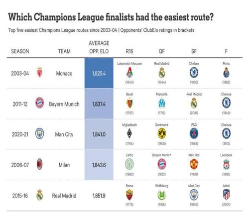 此外,皇家馬德里2015-16賽季的奪冠之路被評(píng)為第五輕松的,他們?cè)跊Q賽中以4-1擊敗同城對(duì)手馬德里競(jìng)技。他們晉級(jí)決賽的道路——不包括決賽本身——被評(píng)為最有利的,先后遇到了羅馬、沃爾夫斯堡,以及在曼努埃爾-佩萊格里尼執(zhí)教最后賽季、最終排名英超第四的曼城。