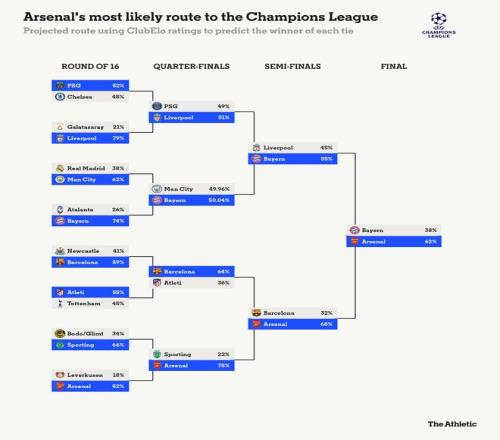 阿森納作為奪冠熱門,很大程度上得益于他們作為本屆歐冠評(píng)分最高球隊(duì)的地位,但淘汰賽的簽位同樣對(duì)他們有利?;谒锌赡艿那榫昂蛯?duì)手的ClubElo評(píng)分,阿森納贏得歐冠的概率為32%,拜仁則以12%位居次席。如果兩隊(duì)在抽簽中互換位置,阿森納的奪冠概率將降至26%,而拜仁的概率將升至17%左右