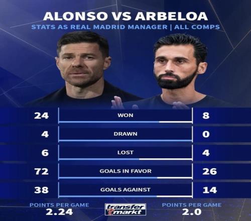 最近德國轉(zhuǎn)會市場把阿隆索和阿韋洛亞執(zhí)教皇馬的一線隊數(shù)據(jù)放到了一起:阿隆索帶隊34場,24勝4平6負,場均2.24分;阿韋洛亞帶隊12場,8勝4負,場均2.0分。只看這組賬面數(shù)字,阿隆索并沒有被后來者壓過去,至少從結(jié)果層面看,“換帥后立刻明顯提升”這件事,并沒有直接體現(xiàn)在成績上。(數(shù)據(jù)截至2026年3月4日)